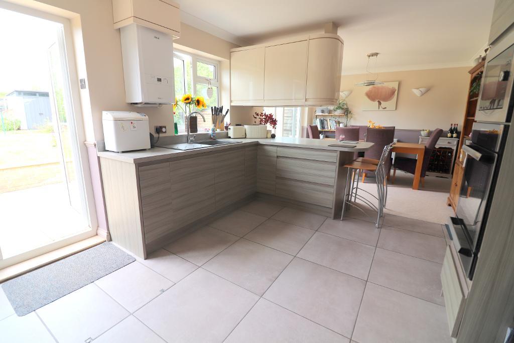 The ground floor layout consists of an entrance hall with stairs leading to the first floor, a spacious living room with a feature gas fire. The heart of the home is an impressive 25ft open-plan kitchen/diner equipped with ample units, breakfast bar, integrated appliances & two sets of doors opening to the rear garden. Separate utility area leading to the garage & wet room. On the first floor, there are four well-proportioned bedrooms & a refitted family bathroom suite.