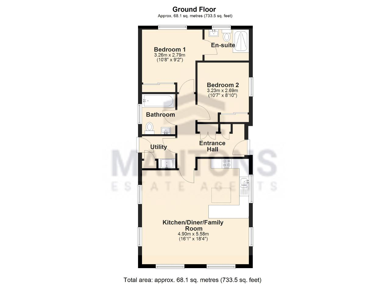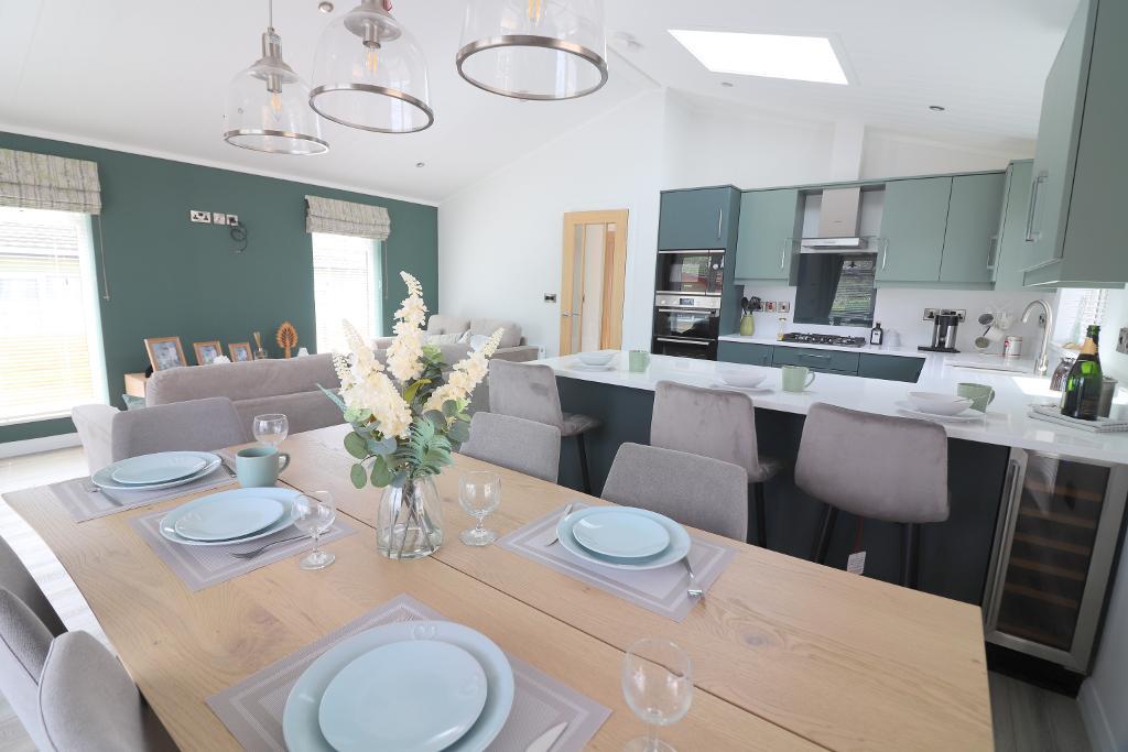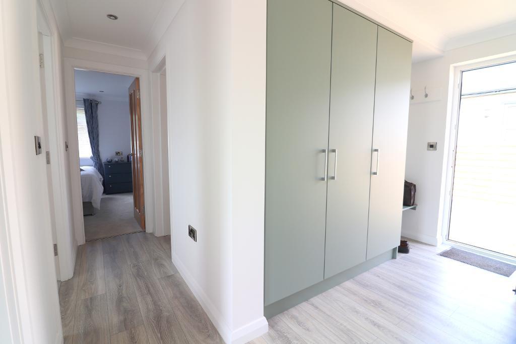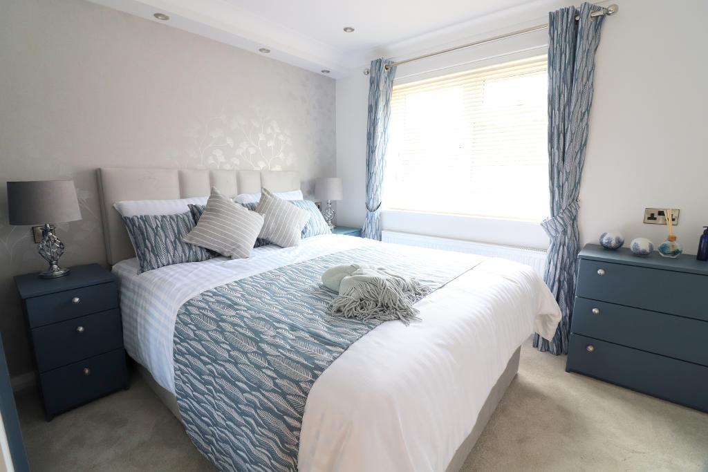 The layout comprises a welcoming entrance hall with built-in storage, two spacious double bedrooms with fitted wardrobes & a master bedroom with en suite shower room. The kitchen area features ample cabinetry, a breakfast bar & integrated appliances including a fridge/freezer, dishwasher, microwave, double oven & gas hob. The adjoining living & dining areas are bright & airy, thanks to multiple windows & skylight. A separate utility room & a beautifully appointed bathroom suite add to the property's practical appeal.