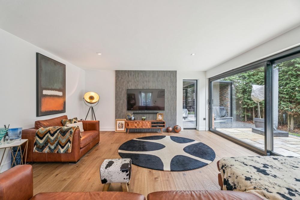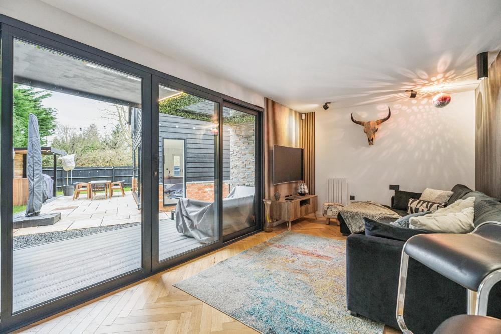 The grand entrance hall is flooded with natural light & sets the tone for the rest of the property, complemented by a stylishly fitted guest cloakroom & useful storage cupboard. To the rear, the spacious living room provides an ideal family & entertaining space, featuring a striking feature wall & impressive six-meter sliding doors that open seamlessly onto the garden. The superb 20ft kitchen/diner is thoughtfully designed with integrated appliances, quartz worktops & an attractive feature brick wall, creating a stylish yet practical hub of the home. A generously sized utility room offers ample additional storage & space for further appliances.